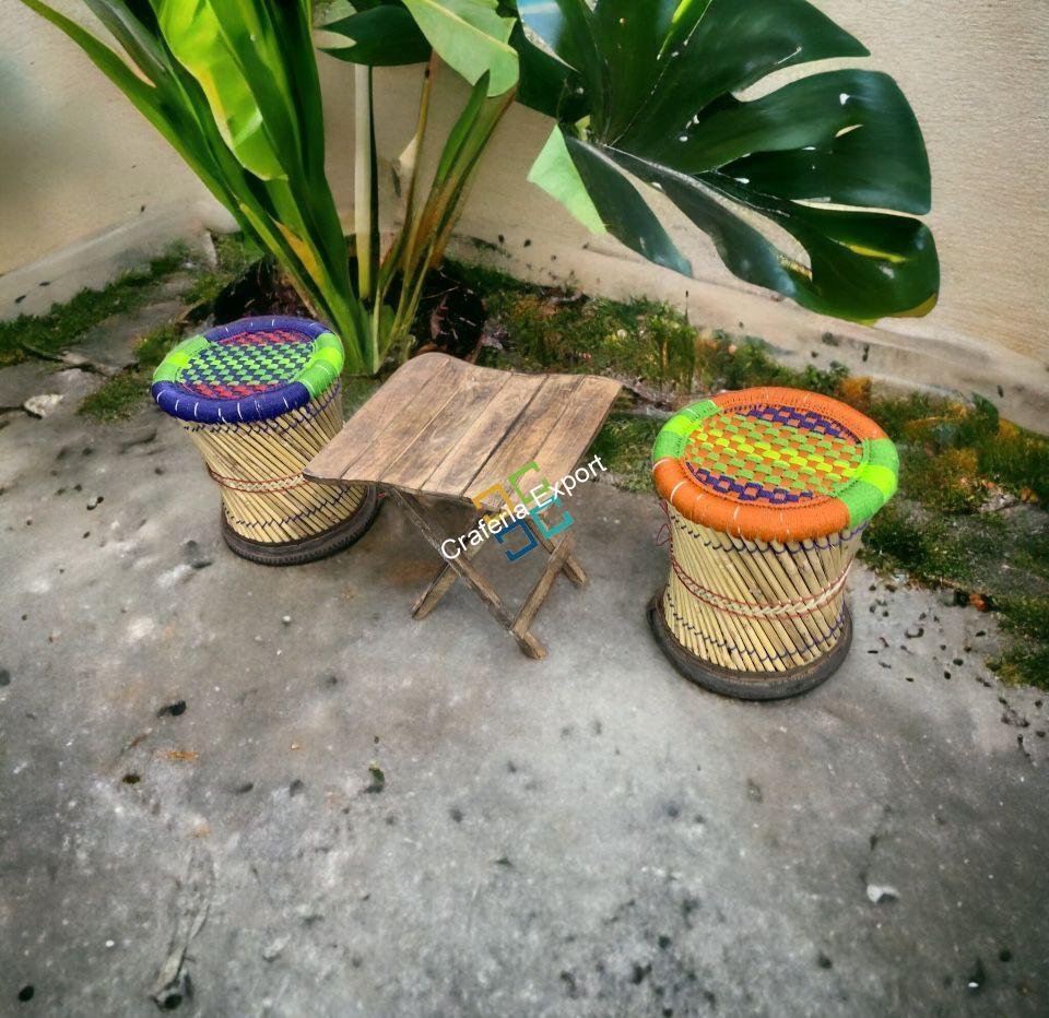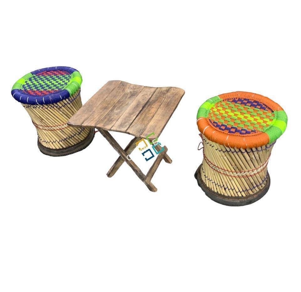 - Bamboo Mudha stools with folding wooden table.